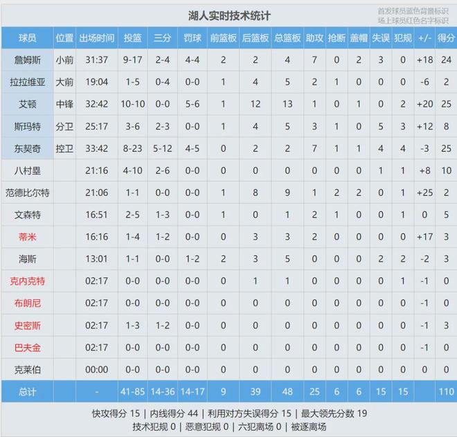 全场结束,湖人110-93大胜猛龙,下一场后天打掘金。东契奇25分2板7助、詹姆斯24分4板7助2帽。艾顿10投10中,怒砍25分13板,正负值+20仅次于范德彪(+25)。巴恩斯22分9板、马穆20分6板、英格拉姆19分6板7助3断。