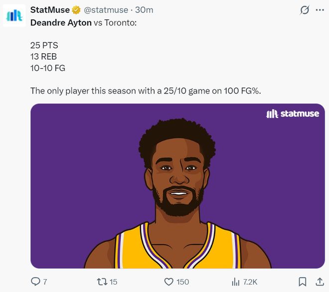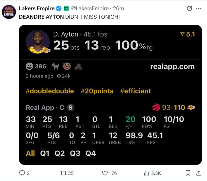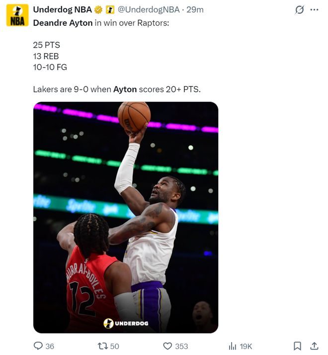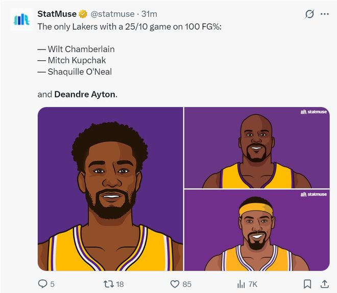 这场比赛后艾顿创造了多项纪录:1.艾顿成为湖人队史首位100%+25+10+0失误的球员;