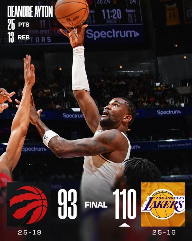常规赛,湖人主场110-93战胜猛龙。