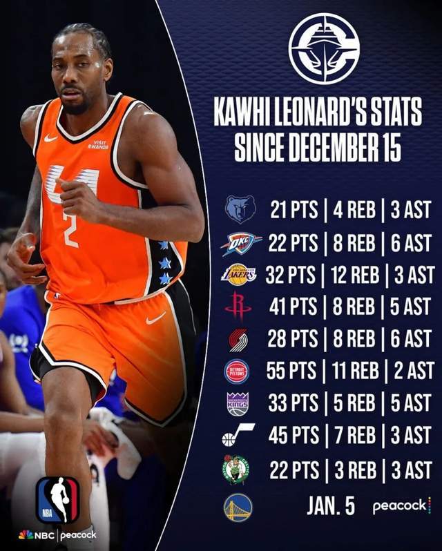特别结合近期快船战绩回暖,更是完全离不开伦纳德的火力输出。