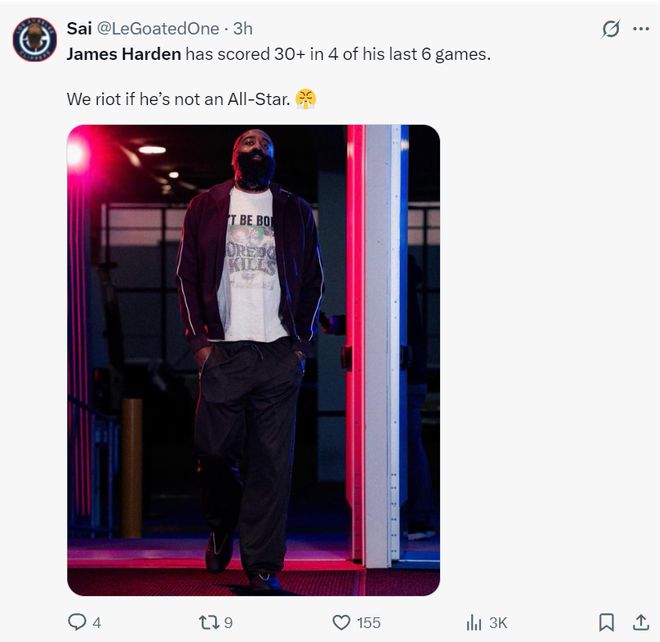 在全明星投票结束的消息后,哈登带领快船队110-106击败奇才豪取六连胜再度成为西部第十进入附加赛,哈登用这场比赛打脸了那些投票的NBA球员,因为他才是快船的基本盘,就算莱昂纳德伤停他也可以带队取得胜利。