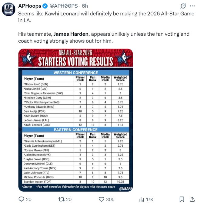 北京时间1月20日,NBA官方公布了最终的全明星球迷投票,快船的莱昂纳德561253排在第13,快船的哈登599911排在第12。