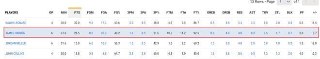 过去的6场比赛小卡只打了4场但快船全部取得了胜利,过去的15场比赛小卡只打了13场,快船也取得了13胜2负的战绩,过去的15场比赛哈登打了14场,场均登场时间哈登场均37.3分钟,小卡场均36分钟。