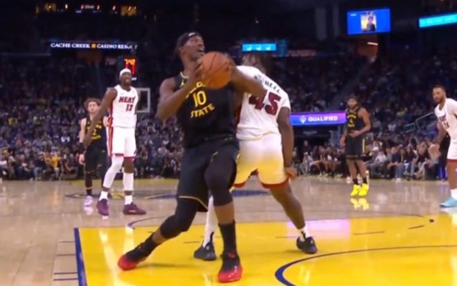 比赛进行到第三节还剩7分多钟,勇士以77-75微弱领先。巴特勒在试图接队友高吊传球并完成上篮时,与热火后卫戴维恩·米切尔发生身体接触。