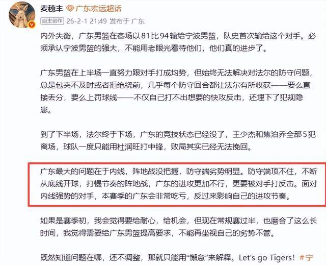 那么,广东男篮为何会输给宁波队呢?赛后,广东媒体人麦穗丰老师给出了自己的观点,在他看来,“广东最大的问题在于内线,阵地战没把握,防守端劣势明显。防守端顶不住,不断从底线开球,打慢节奏的阵地战,广东的进攻更加不行,更要被对手打反击。面对内线强势的对手,本赛季的广东会非常吃亏,反过来影响自己的进攻节奏。”