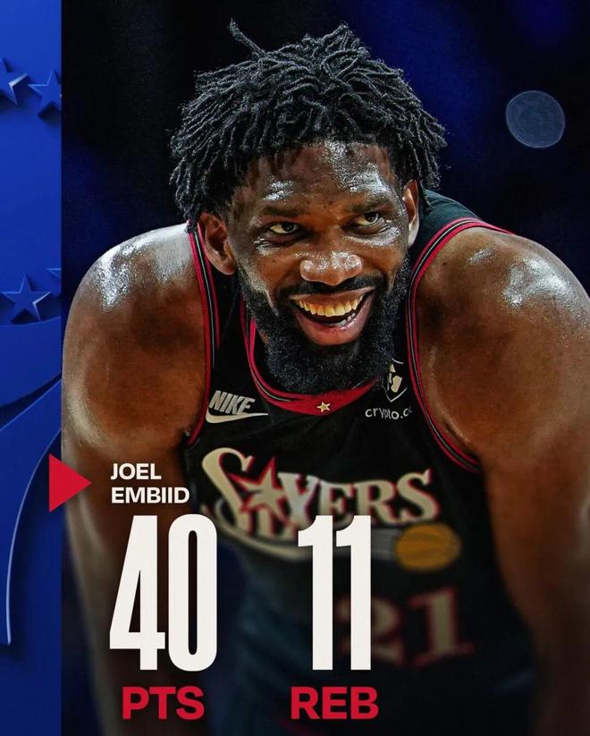 这场的过程也非常精彩,恩比德三节就拿下27分,第四节单节得到10分,最后时刻还助攻马克西(本场拿了40分)完成了上篮绝杀,全场下来,恩比德的正负值+9也是全队最高。