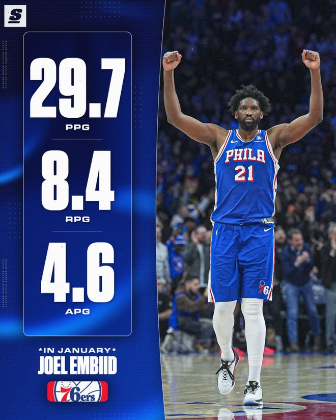 1月份的14场比赛,恩比德场均29.7分8.4篮板4.6助攻,命中率54%,费城10胜4负。