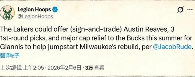 不过如果雄鹿在交易截止日送走字母哥,湖人几乎毫无机会,一方面他们手中筹码实在有限,只握有一个首轮签,显然满足不了雄鹿的胃口;另一方面,因为詹姆斯的合同,他们后续补强的操作空间被堵死。