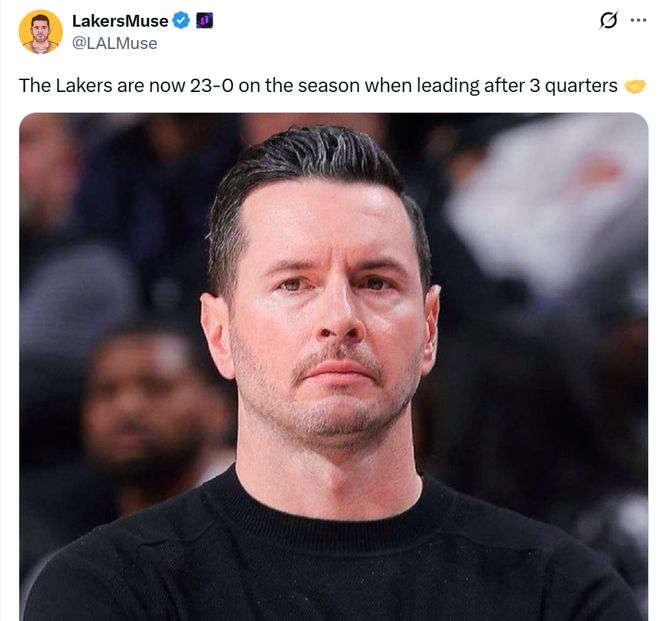 本场击败勇士队后,开赛至今,当湖人队领先进入第四节时拿到了23胜0负的全胜战绩。