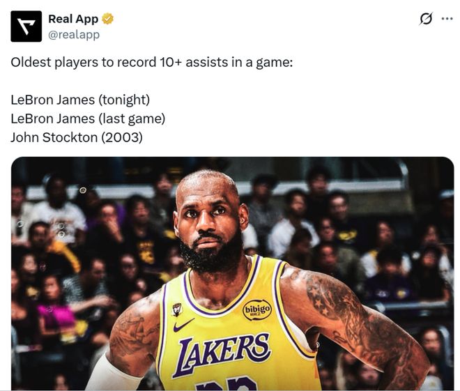 凭借这样的表现,41岁零40天的詹姆斯超越上一场的自己,成为NBA历史上单场送出至少10次助攻最老的球员。