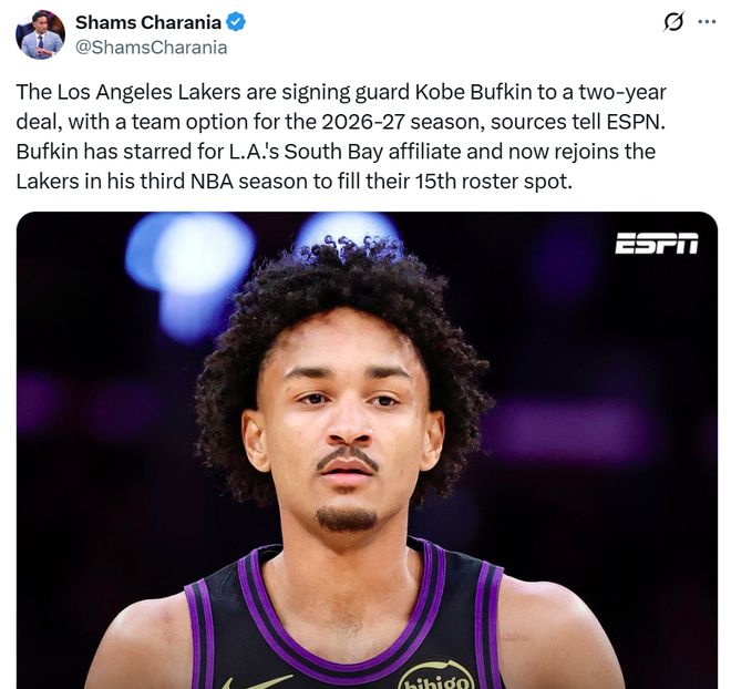 Shams率先曝出消息,指出湖人与巴夫金签下两年合同,第二年为球队选项。
