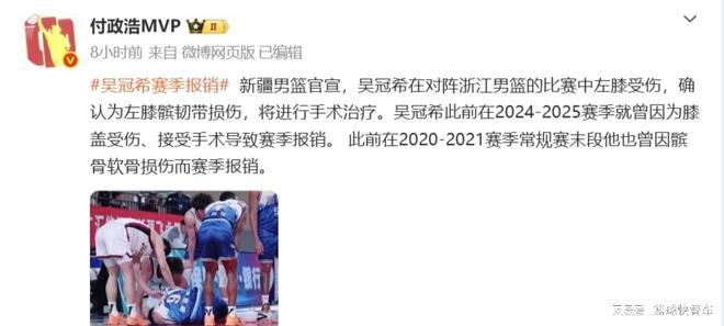 当然,对于吴冠希本人而言,这也是极为糟糕的一件事情。要知道,自从2021年开始,这已经是他第4次赛季报销了。2021年,他因髌骨软骨损伤赛季报销。一年后的2022年,左臂受伤赛季报销。随后的2024年,他又因为膝盖手术而赛季报销。现如今,吴冠希再次因伤赛季报销。这已经是他最近5年里,第4次赛季报销了。对于一名职业球员来讲,这样的反复伤停,确实是非常打击自信心的。