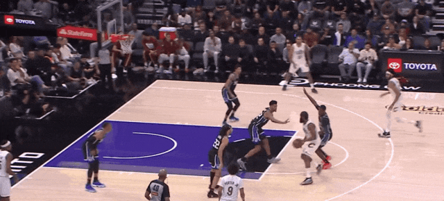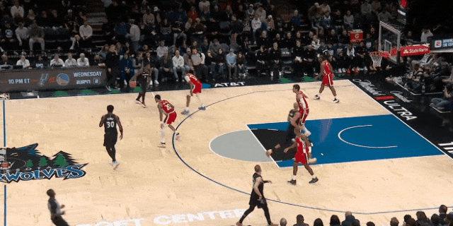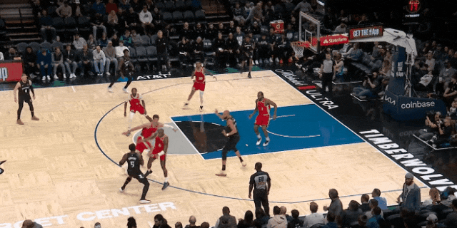 下半场莱纳德右腰下球、转身、右肩假动作翻投华兹:戈贝尔在弱侧三分线跟科林斯,兰德尔在弧顶三分线跟洛佩斯。