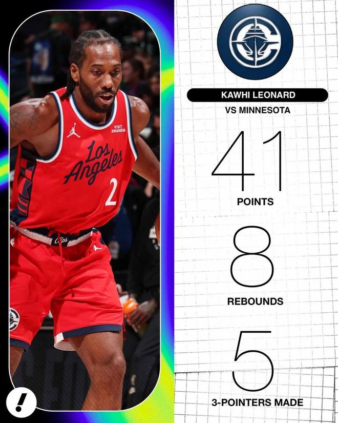 这场比赛,伦纳德又一次交出了炸裂表现:全场出战33分钟,投篮30中14,三分11中5,罚球10中8,拿下41分8篮板2助攻4抢断,在场正负值高达+20。