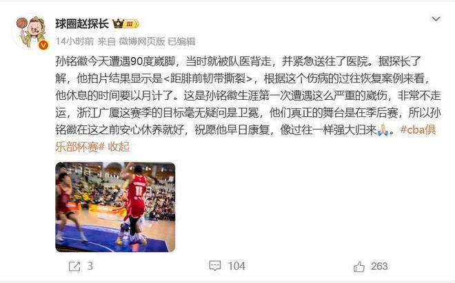 根据媒体人“球圈赵探长”的消息,孙铭徽的拍片结果显示是距腓前韧带撕裂,根据这个伤病的过往恢复案例来看,他的休息时间要以月计了。孙铭徽职业生涯第一次遭遇这么严重的崴伤,非常的不幸,浙江广厦队本赛季的目标是卫冕,他们的舞台在季后赛和总决赛,希望届时孙铭徽可以复出帮助球队在季后赛走得更远吧。