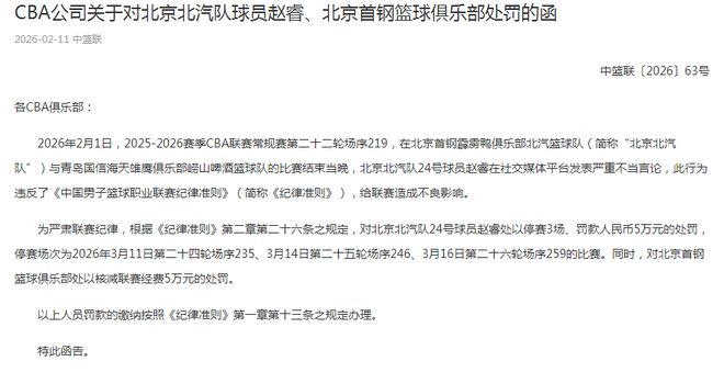 为严肃联赛纪律,根据《纪律准则》第二章第二十六条之规定,对北京24号球员赵睿处以停赛3场、罚款5万元的处罚,停赛场次为2026年3月11日第二十四轮场序235、3月14日第二十五轮场序246、3月16日第二十六轮场序259的比赛。同时,对北京首钢篮球俱乐部处以核减联赛经费5万元的处罚。