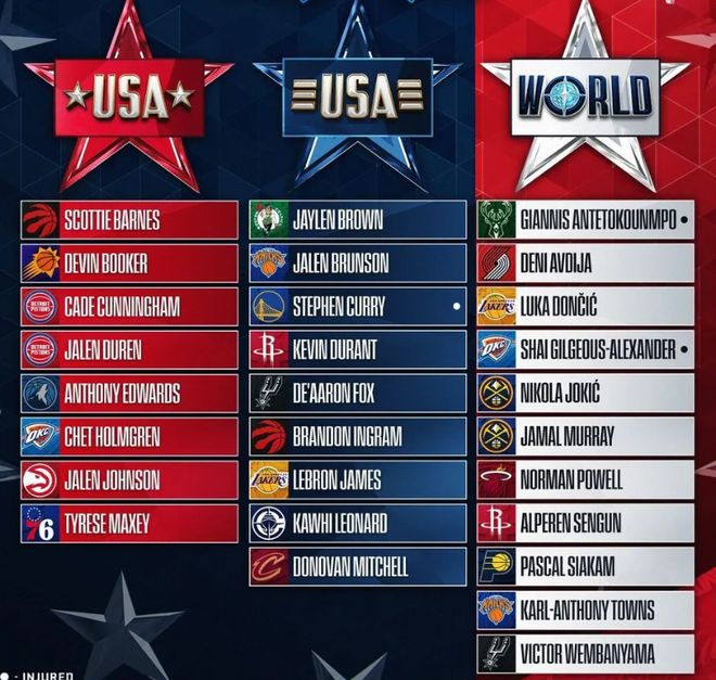 世界队名单:东契奇、约基奇、穆雷、西亚卡姆、唐斯、文班亚马、申京、鲍威尔、字母哥(受伤缺席)、亚历山大(受伤缺席)。