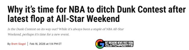北京时间2月17日,美媒ClutchPoints撰文讨论全明星扣篮大赛,认为是时候停办这项赛事了。该美媒还建议NBA是时候推出1v1的单挑赛了。具体解析如下——