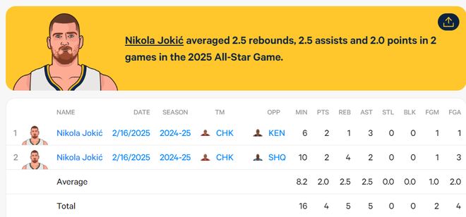 数据媒体StatMuse晒出了约基奇最近两年全明星的数据,今年是5分钟,1中0拿0分2篮板0助攻。