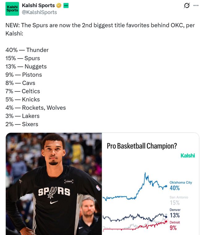在常规赛进入冲刺阶段,预测平台Kalshi Sports更新NBA本季夺冠概率,其中火箭4%并列第八,湖人3%勇士落选,榜首40%断档领先。