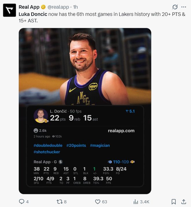 此役东契奇38分钟,24中8,三分10中2,罚球9中4,拿到22分15助攻9篮板1盖帽,命中率33.3%,三分命中率20%,真实命中率39.3%,此役他拿到20+15助攻升至湖人队史第六。