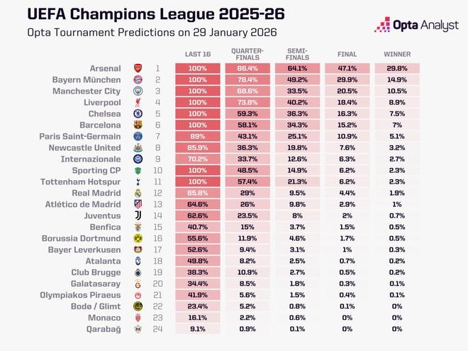 Opta更新欧冠夺冠概率:阿森纳29.8%,拜仁14.9%,曼城10.5%