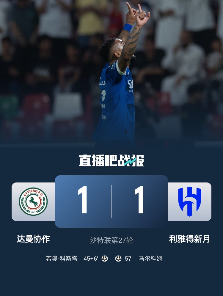 沙特联第27轮,利雅得新月1-1达曼协作。上半场,若奥-科斯塔再补时最后时刻世界波破门;下半场,洛迪助攻马尔科姆破门扳平比分。