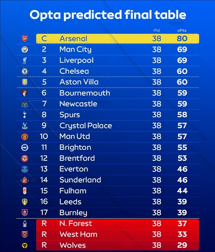 OPTA预测英超最终排名:阿森纳80分夺冠,曼城红军69分,曼联第10