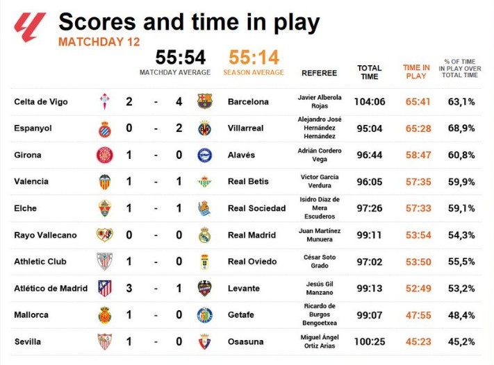 2025-11-11 00:00:14本轮西甲有效时间榜:巴萨4-2塞尔塔超过65分钟最长
