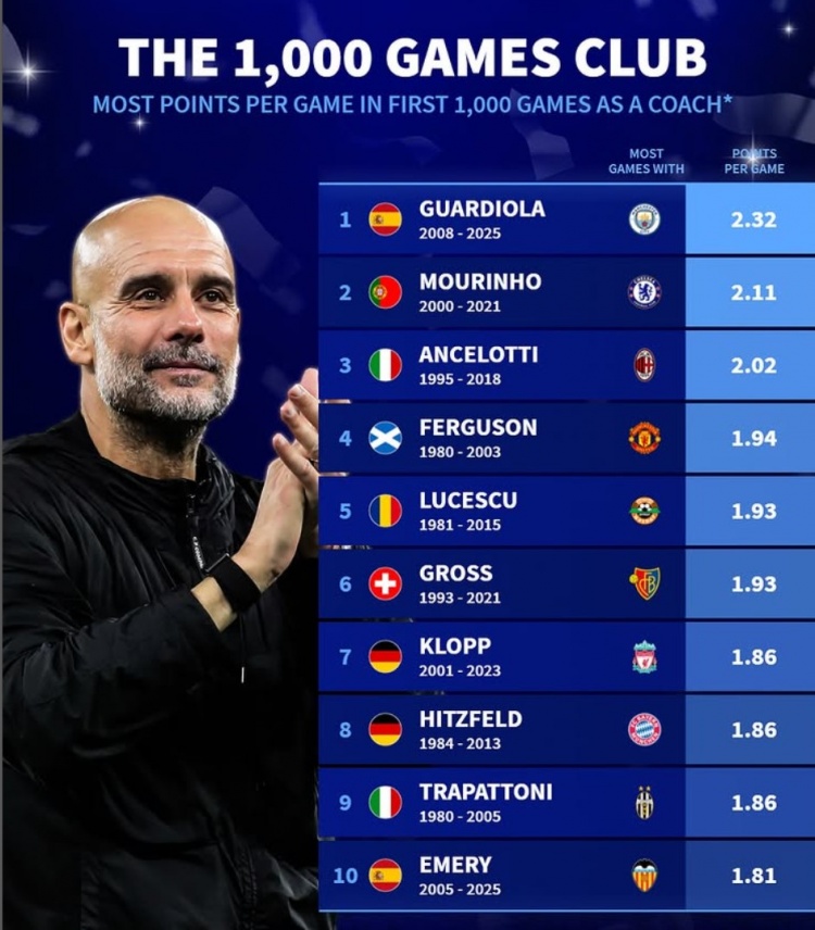 11月10日讯 曼城在本轮英超焦点战3-0完胜利物浦,瓜迪奥拉也就此解锁执教1000场里程碑。《转会市场》统计显示他也是场均拿分最高的千场教头。