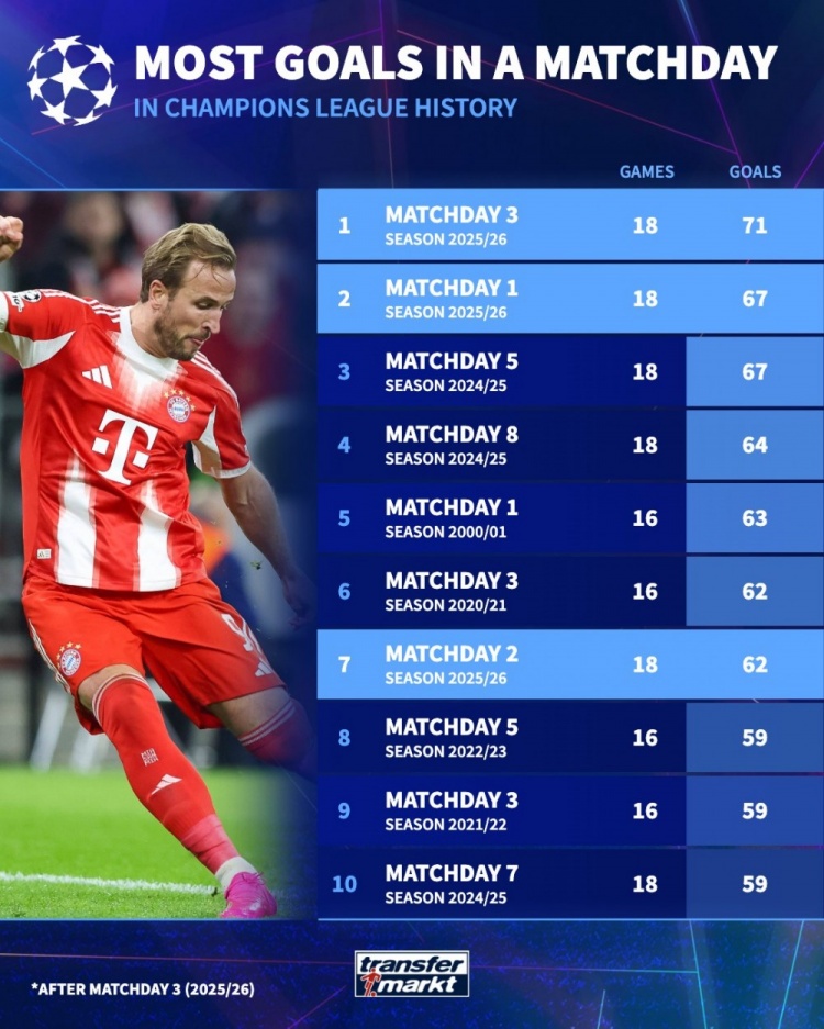 2025-10-24 00:05:06欧冠单轮进球数量榜:本轮18场比赛71球居首,本赛季首轮67球次席